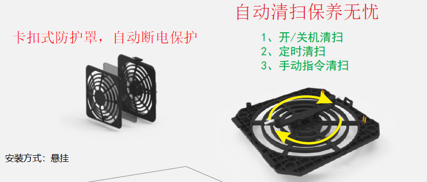 ● 电机自动清洁装置,解决行业直流风机1周保养一次,3个月内保证静电消除效果可佳;
