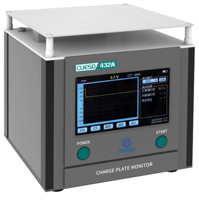 CUESD 432A 静电测试仪是根据ANSI/ESD-S20.20-2014标准制造,通过充电板(152mm×152mm)、绝缘柱和接地板形成一个固定值的电容(20±2pF)。利用非接触式传感器实时测量充电板上的电压,同时监测充电板上电荷被离子中和的时间。是专业用于测量静电消除器(如离子风机、离子风棒、离子风枪等)静电消除能力以及离子平衡度的精密仪器。
